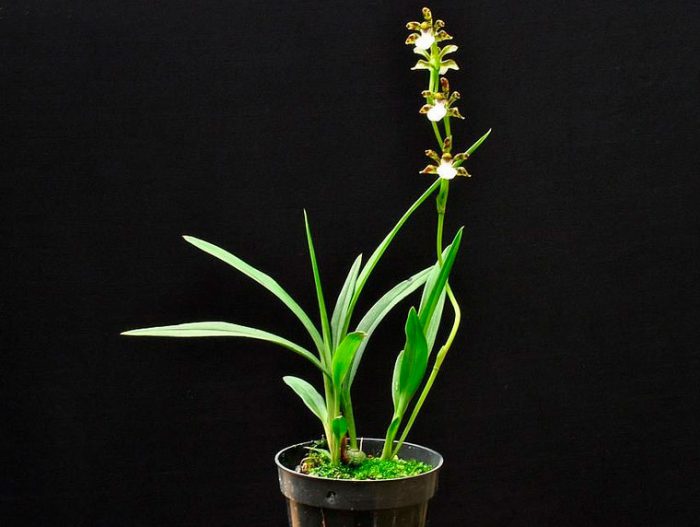 Цветонос в длину может достигать 25 сантиметров, при этом цветочки имеют диаметр от 5 до 6 сантиметров. Узенькие, практически ремневидные лепестки и чашелистики обладают равномерным коричневато-бордовым окрасом. При этом в их основании находятся пятнышки зеленого цвета. На белоснежном лепестке имеются полоски-прожилки размытого фиолетового окраса.