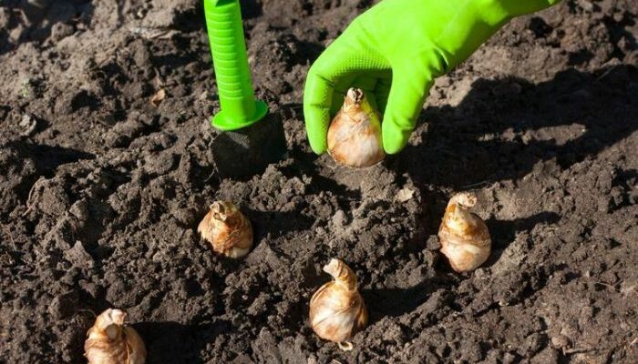 Выкопайте на подготовленном участке посадочные ямки, глубина которых должна быть равна 3 диаметрам луковички. Затем в ямку засыпают горсть песка, 2 большие ложки древесной золы и укладывают туда луковицу. Засыпьте ямку до половины землей, смешанной с компостом, и хорошо полейте, после этого заполните ее грунтом доверху и утрамбуйте его поверхность.